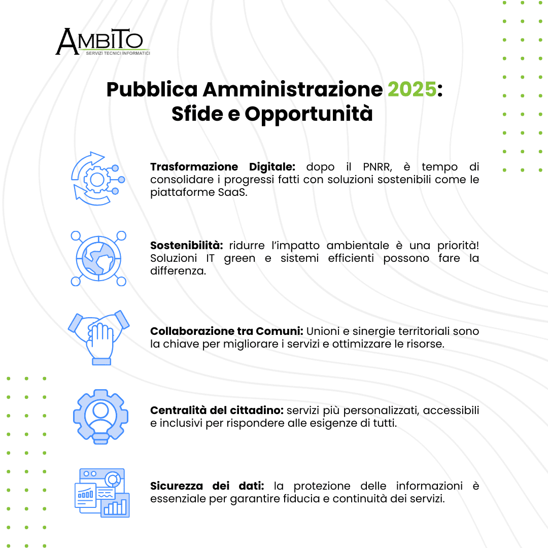 Il 2025 si prospetta come un anno cruciale per la Pubblica Amministrazione, con l’opportunità di consolidare i progressi raggiunti e affrontare nuove sfide in cinque ambiti fondamentali: trasformazione digitale, sostenibilità ambientale, collaborazione intercomunale, centralità del cittadino e sicurezza dei dati.